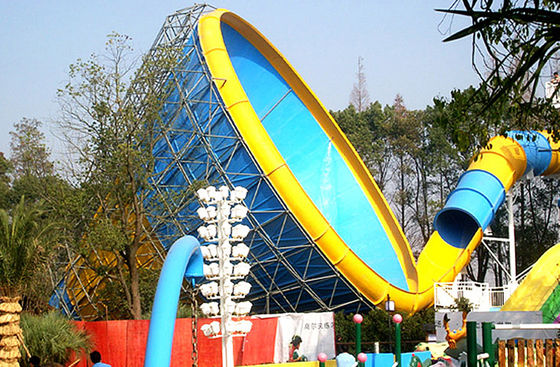 Tornado slide was honor as “the gold ticket” by the international tourism the most popular water attractions in the year of 2006. It's suitable for indoor or outdoor water park.The diameter is 3.65 m at its minimal width, 18.6 m at its maximal width, the start point is about 2.7 m wide, 38.5 at its length, buffer width is 3.04 m, 12.04 m long. 4 riders sitting on the four-leaf shape raft, slide from the 14.6 m high platform, fly into the giant tornado water slide, just like absorbed by hurricane, experience the feeling of soaring in the air especially suitable for adventurous people. Its capability is 720 riders per hour, makes it the essential item for huge water park.